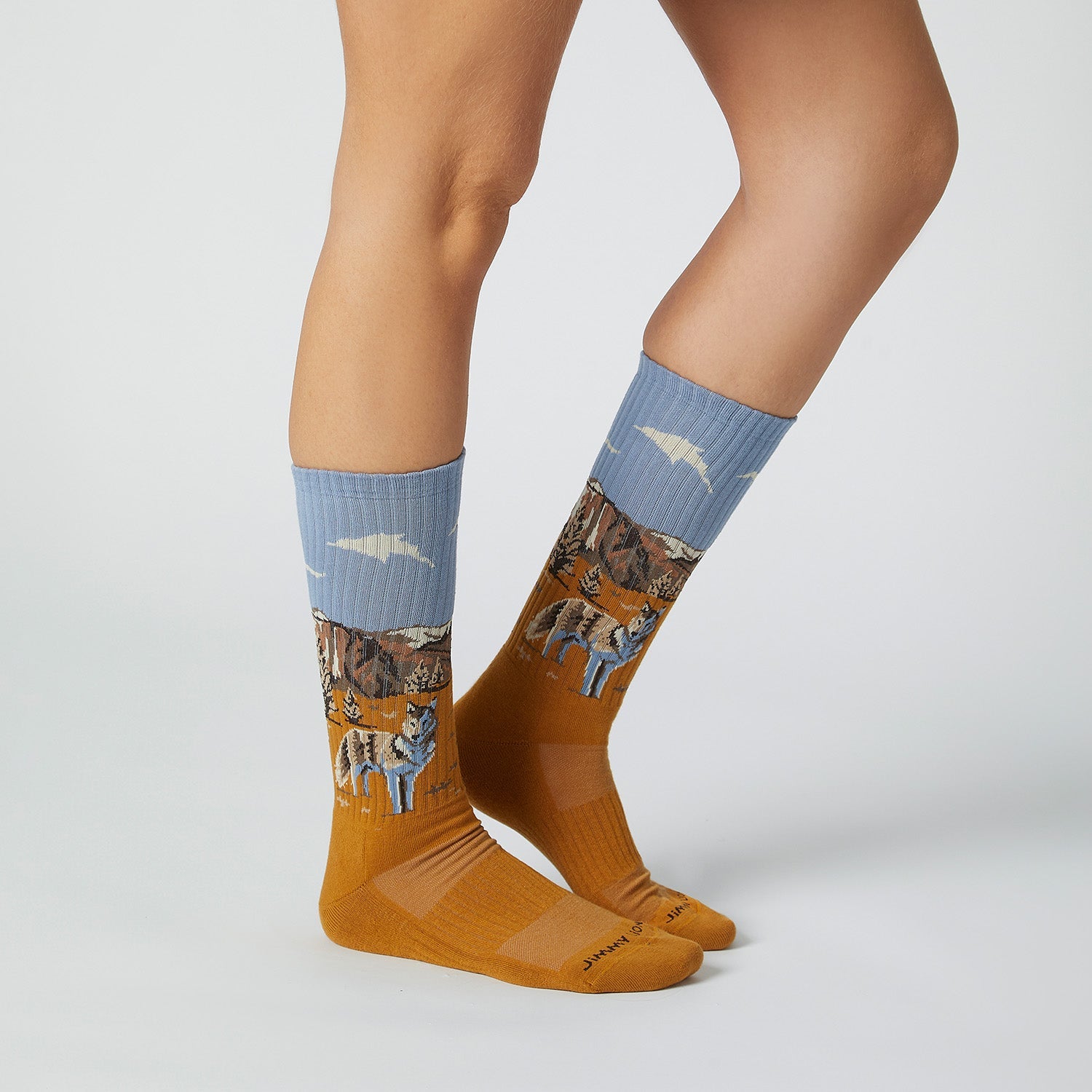 Calcetines deportivos unisex con diseño de lobo en plena naturaleza.