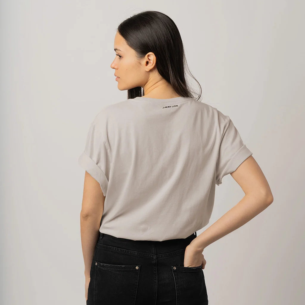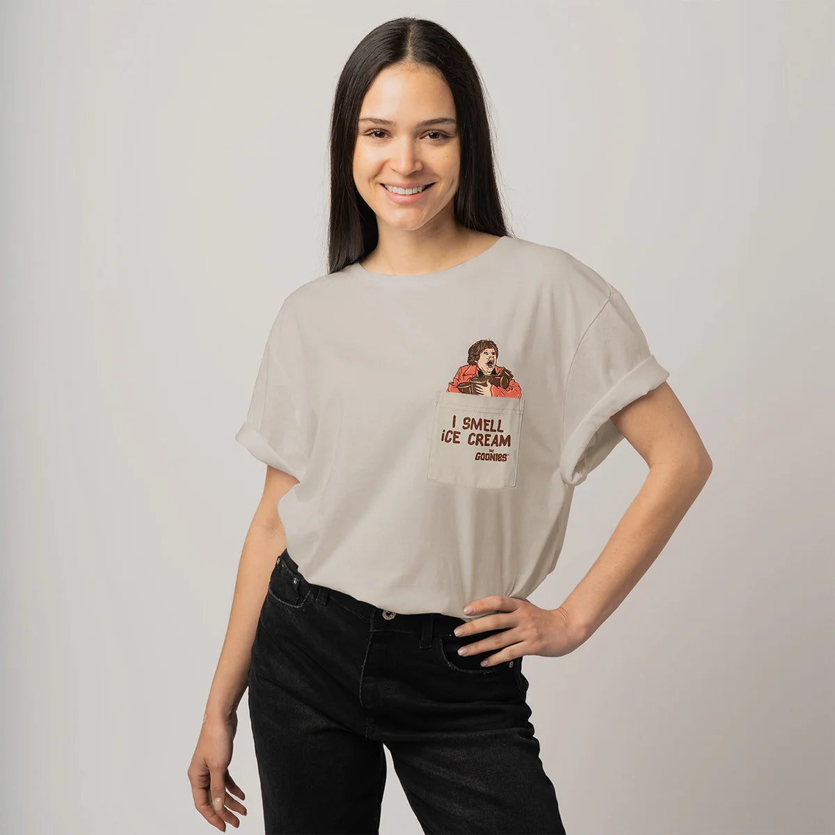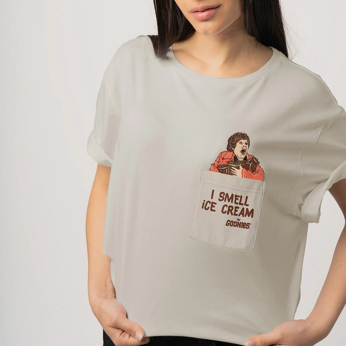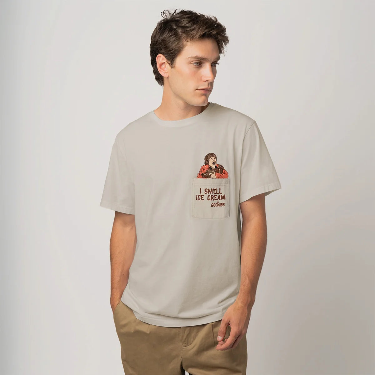 Camiseta de algodón gris claro con Chunk disfrutando de un helado que asoma del bolsillo delantero, con la frase: "I SMELL ICE CREAM".