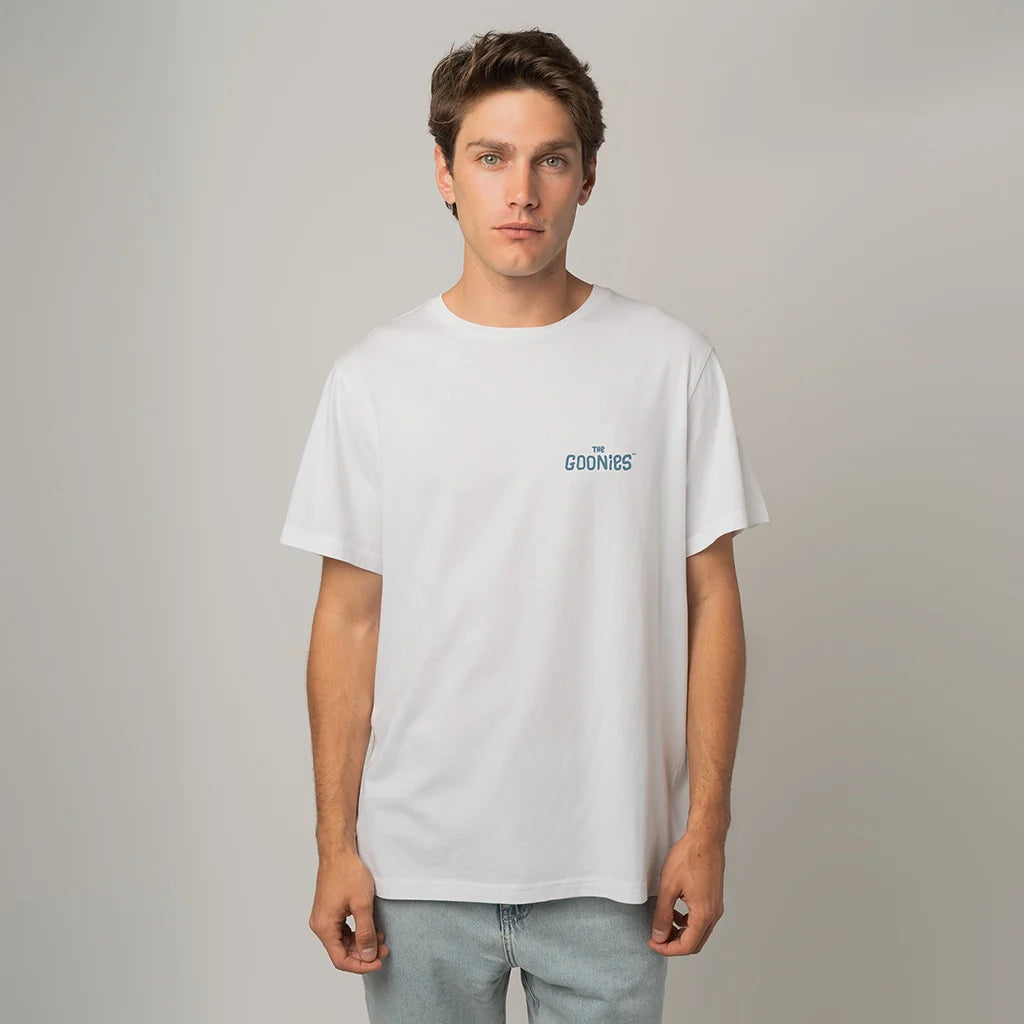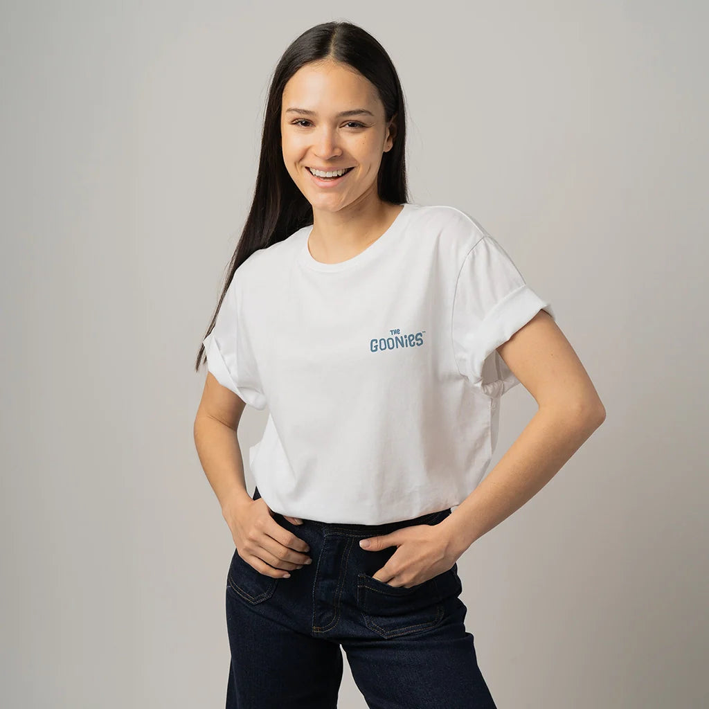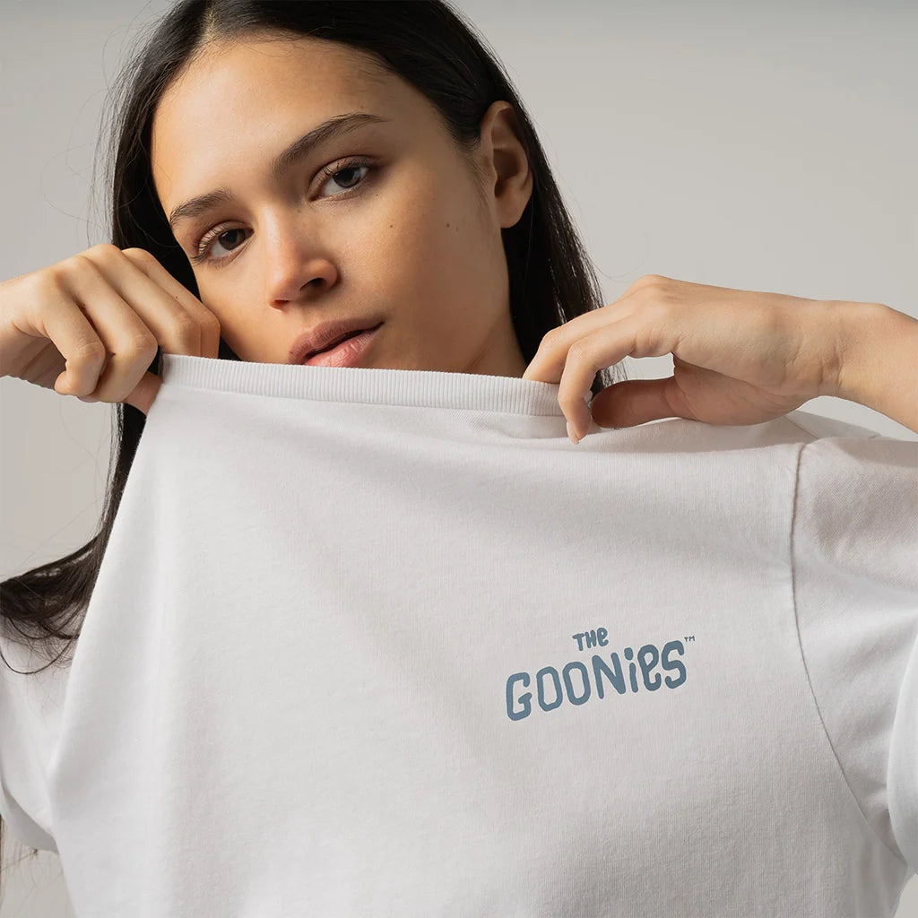 Camiseta de algodón blanca con el título The Goonies™ en el frente y la cara de Sloth en la parte trasera con el texto "HEY YOU GUYS!".